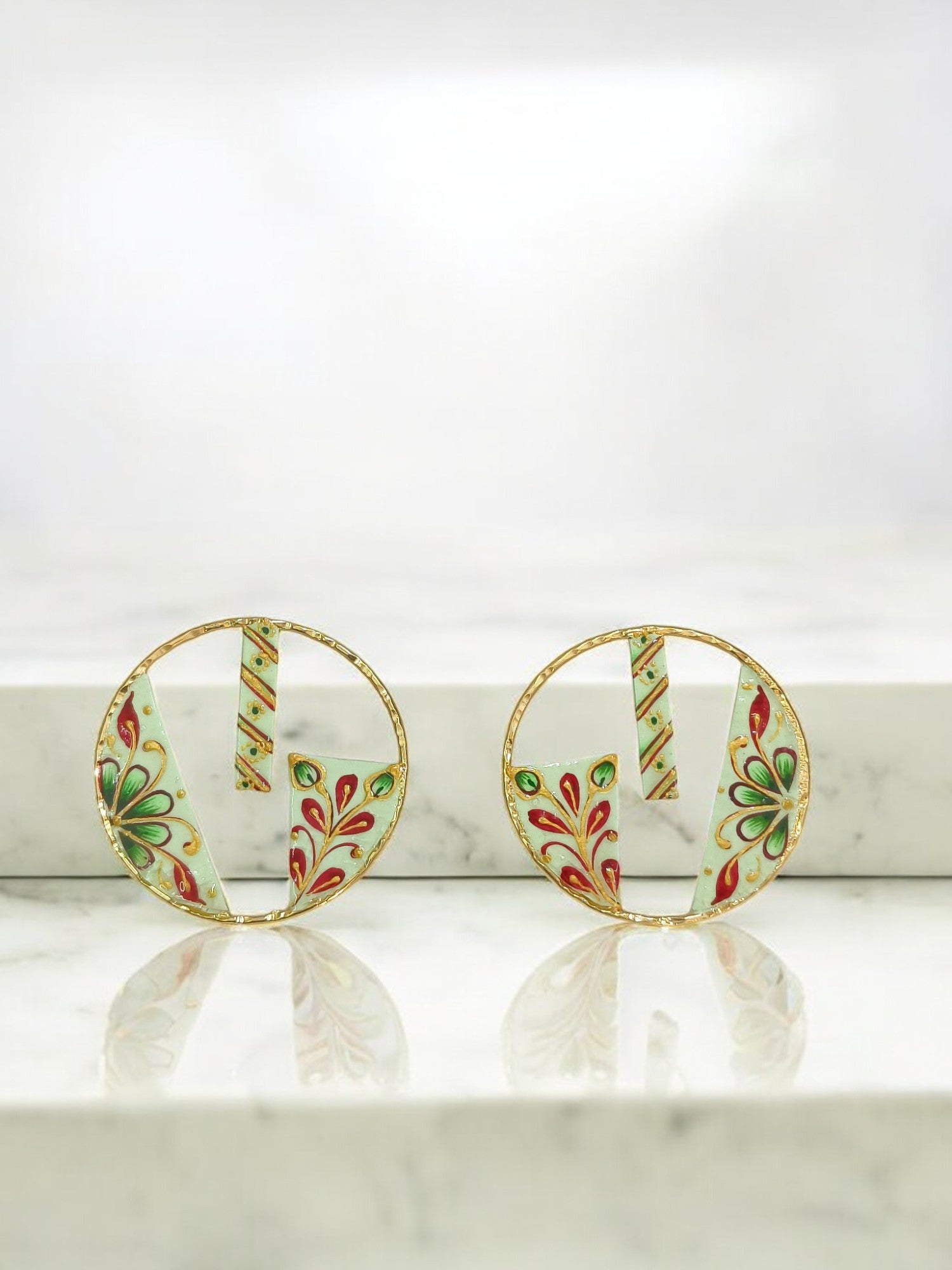 Enhance your jewelry collection with these exquisite Handcrafted Meenakari Enamel Earrings, a perfect blend of traditional craftsmanship and contemporary elegance. These round earrings feature a beautifully detailed floral design in rich green, pink, and gold tones, creating an eye-catching accessory for any occasion.1.MATERIAL: Crafted from high-quality brass metal with elegant gold-tone finish for lasting durability and shine. Aesthetic Appeal 2.DESIGN: Contemporary hand painted geometric style featuring a unique combination of straight bars and curved elements that adds up to your style. 3.VERSATILE WEAR: Lightweight and comfortable earrings suitable for both casual and formal occasions. 4.DIMENSIONS: Each earring measures approximately 2 cm in length, making them a perfect statement piece.5. BRASS JEWELLERY CARE: Try to avoid contact with water and chemicals (bleach, perfume, bug spray, sunscreen, etc). This will cause your brass jewelry to oxidize faster. 6. Why Brass Jewellery?