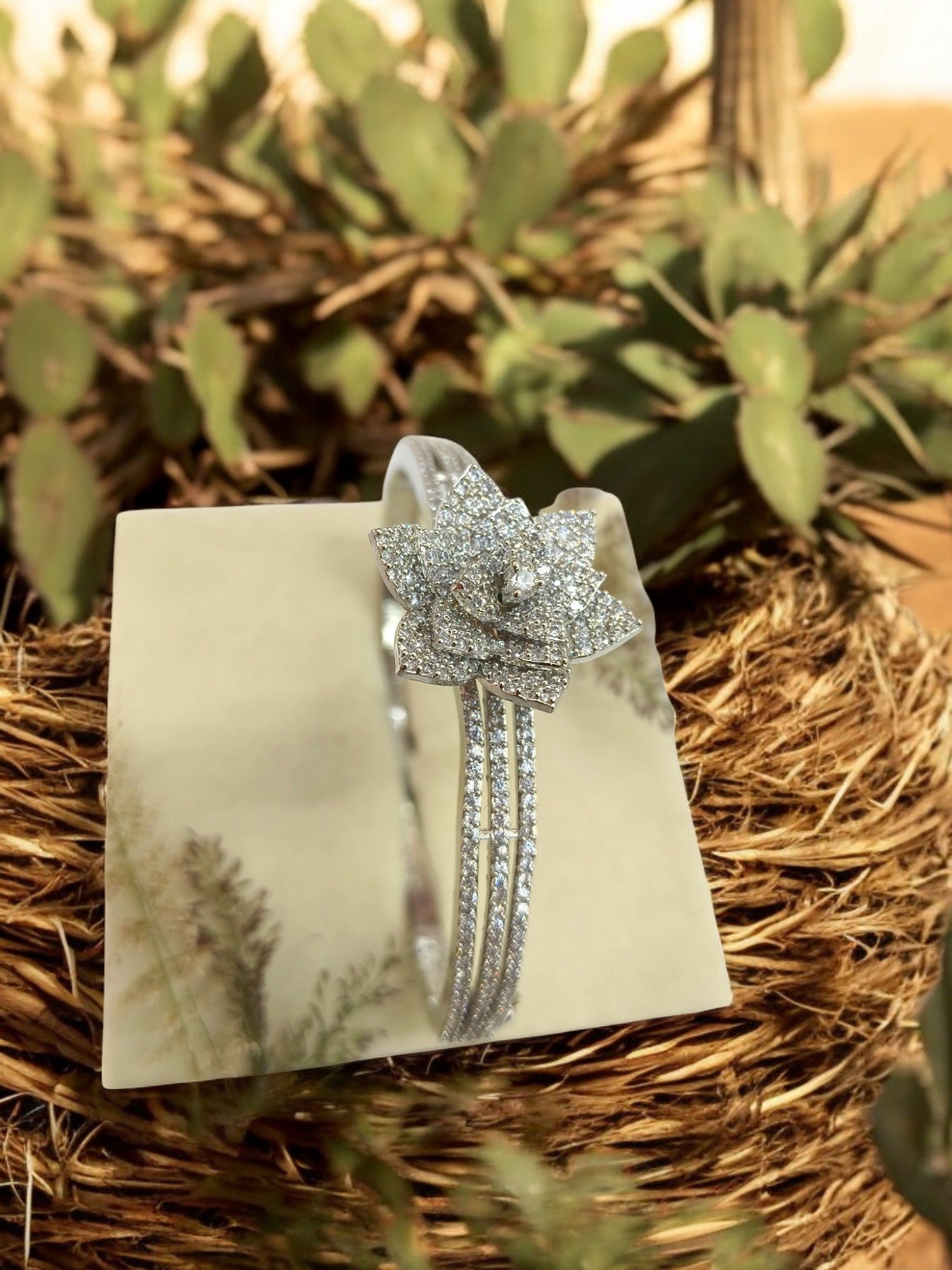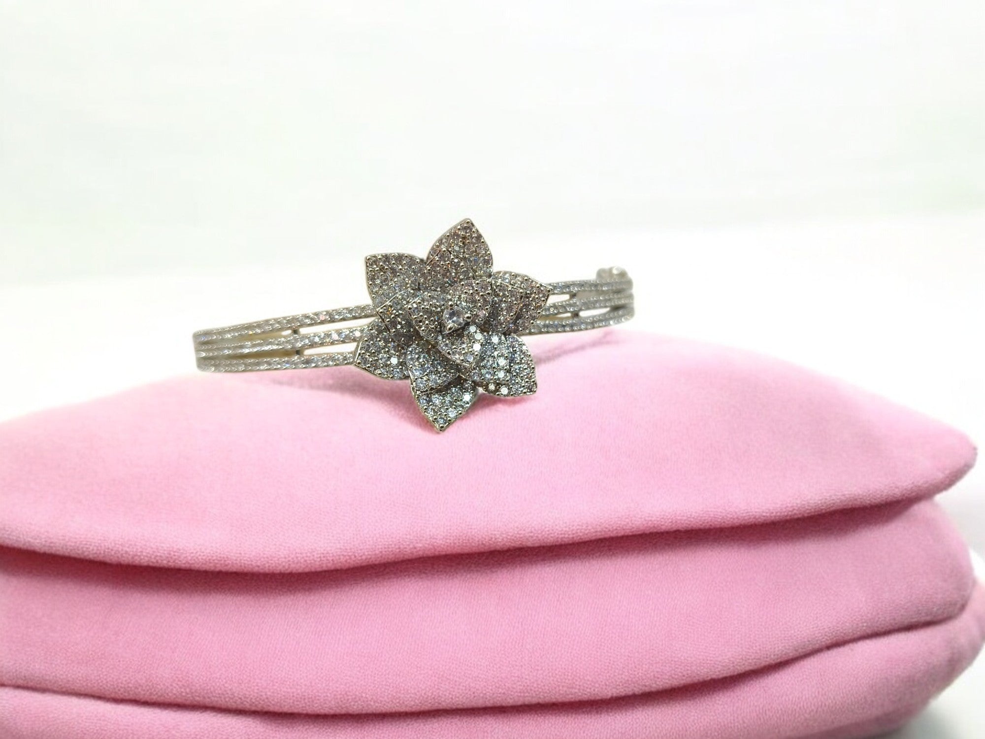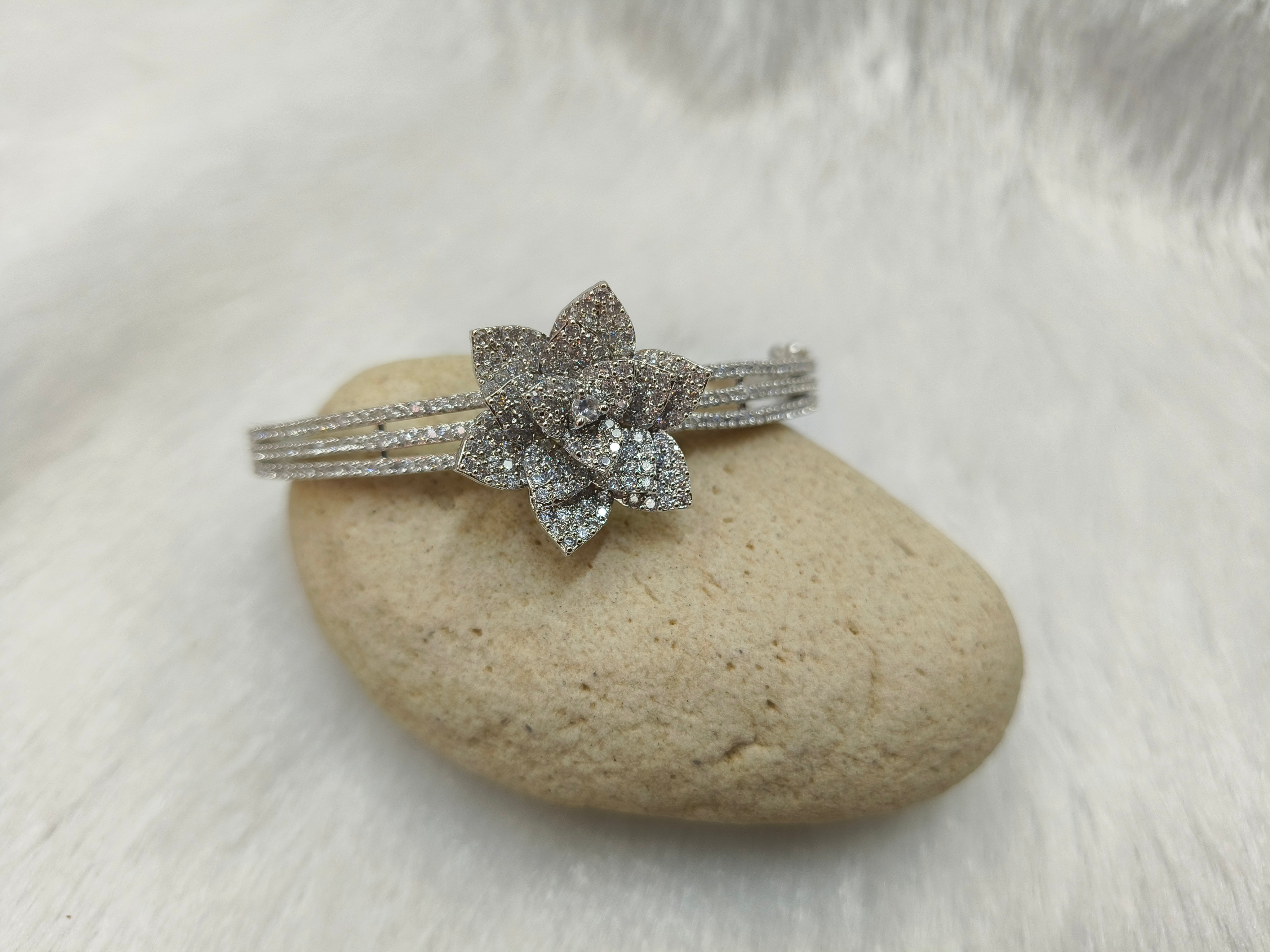 Luxury Floral AD Silver Bracelet – Sparkling Flower Design for Women. Elevate your style with this stunning silver floral bracelet, meticulously crafted with pavé-set zircon stones for a dazzling sparkle.